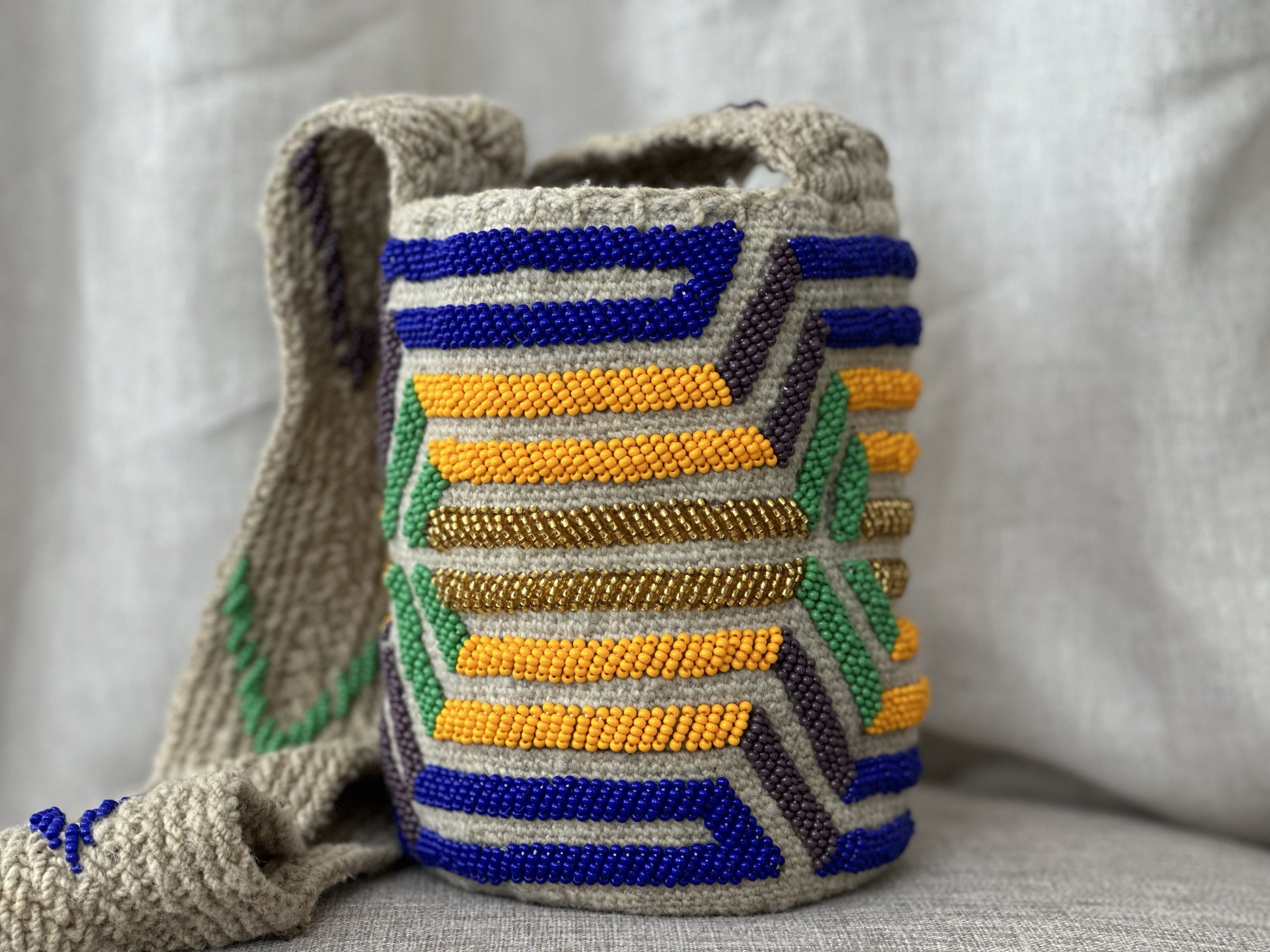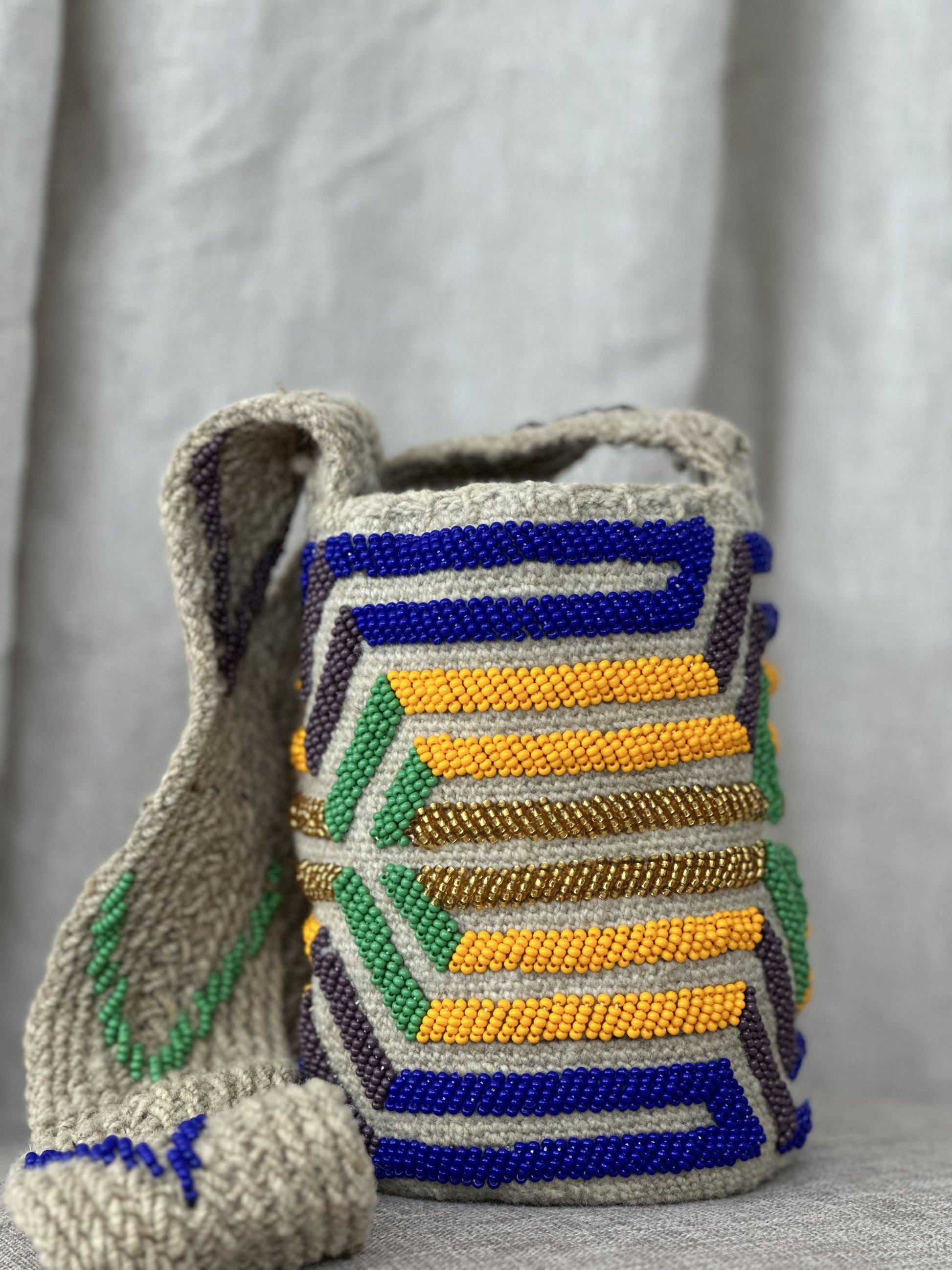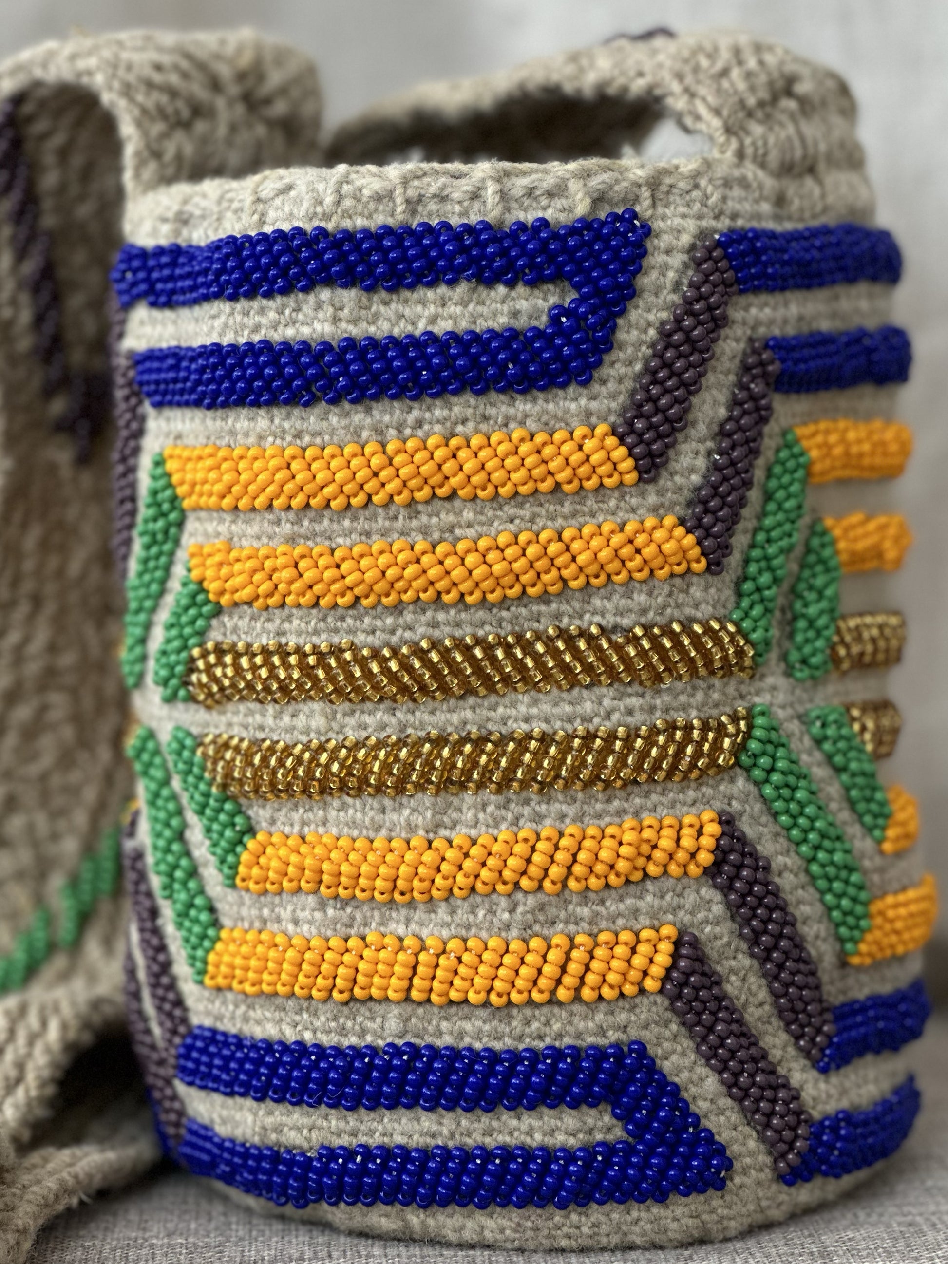 Nuestras mochilas Arhuacas* han sido cuidadosamente tejidas a mano por mujeres indígenas a lo largo de 3 semanas.