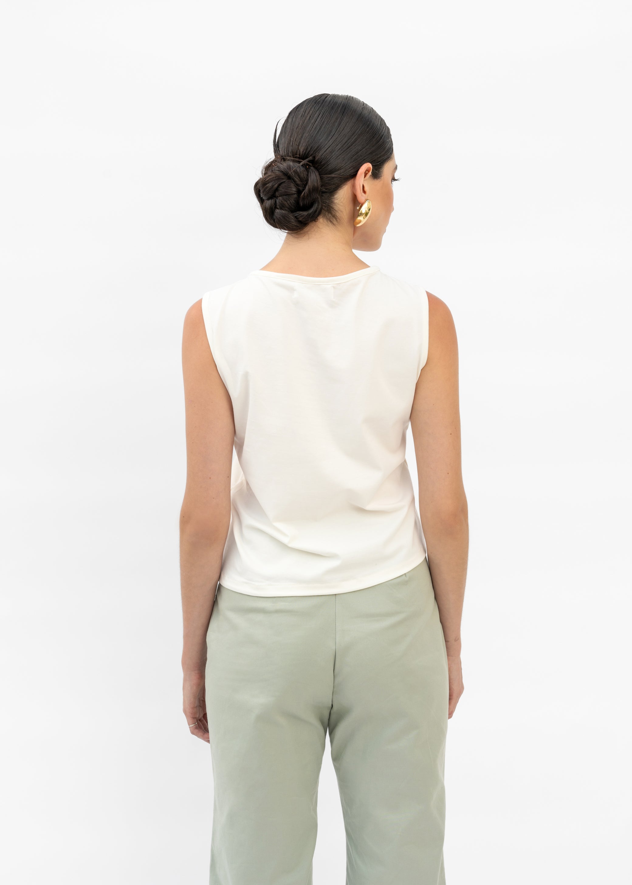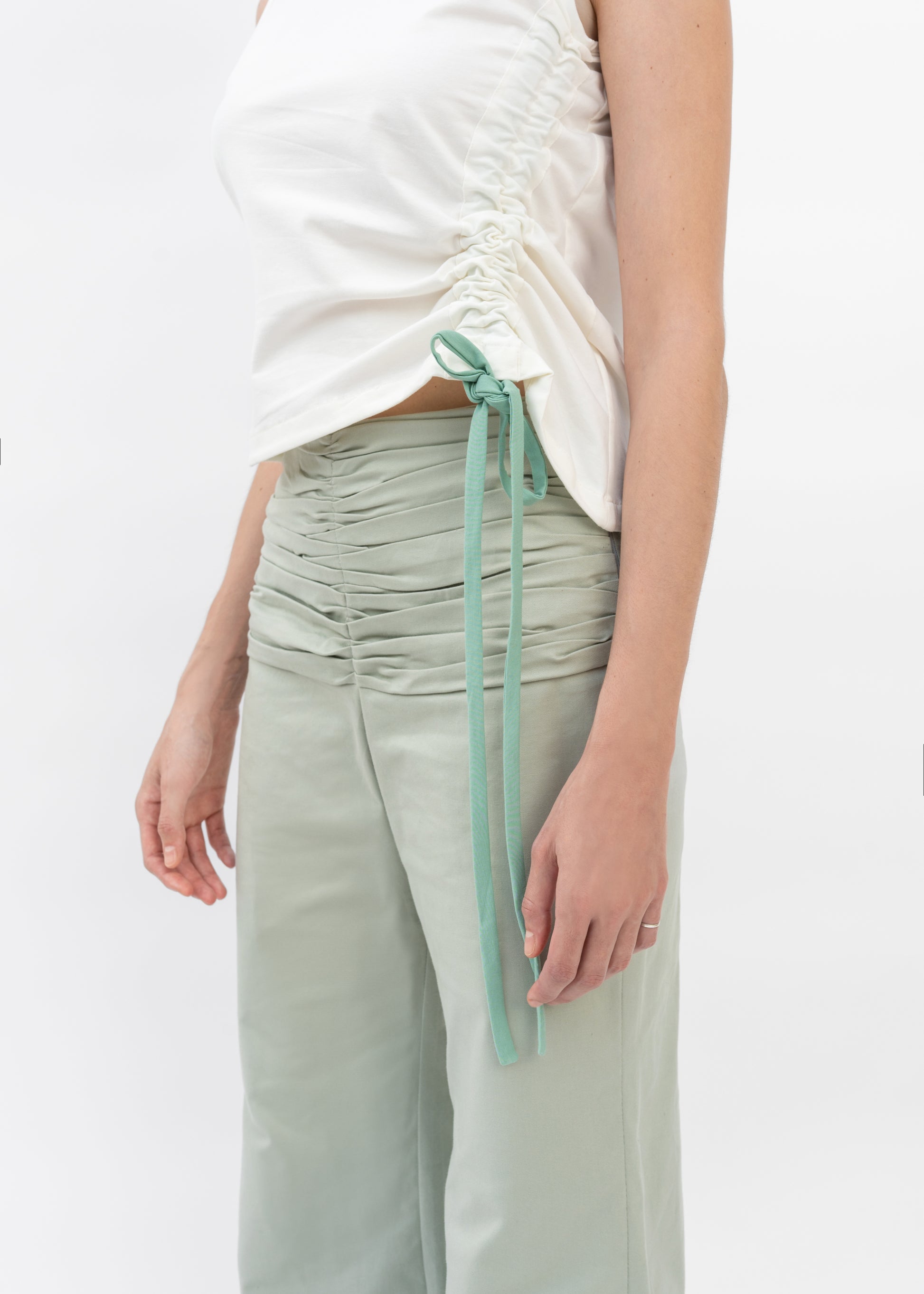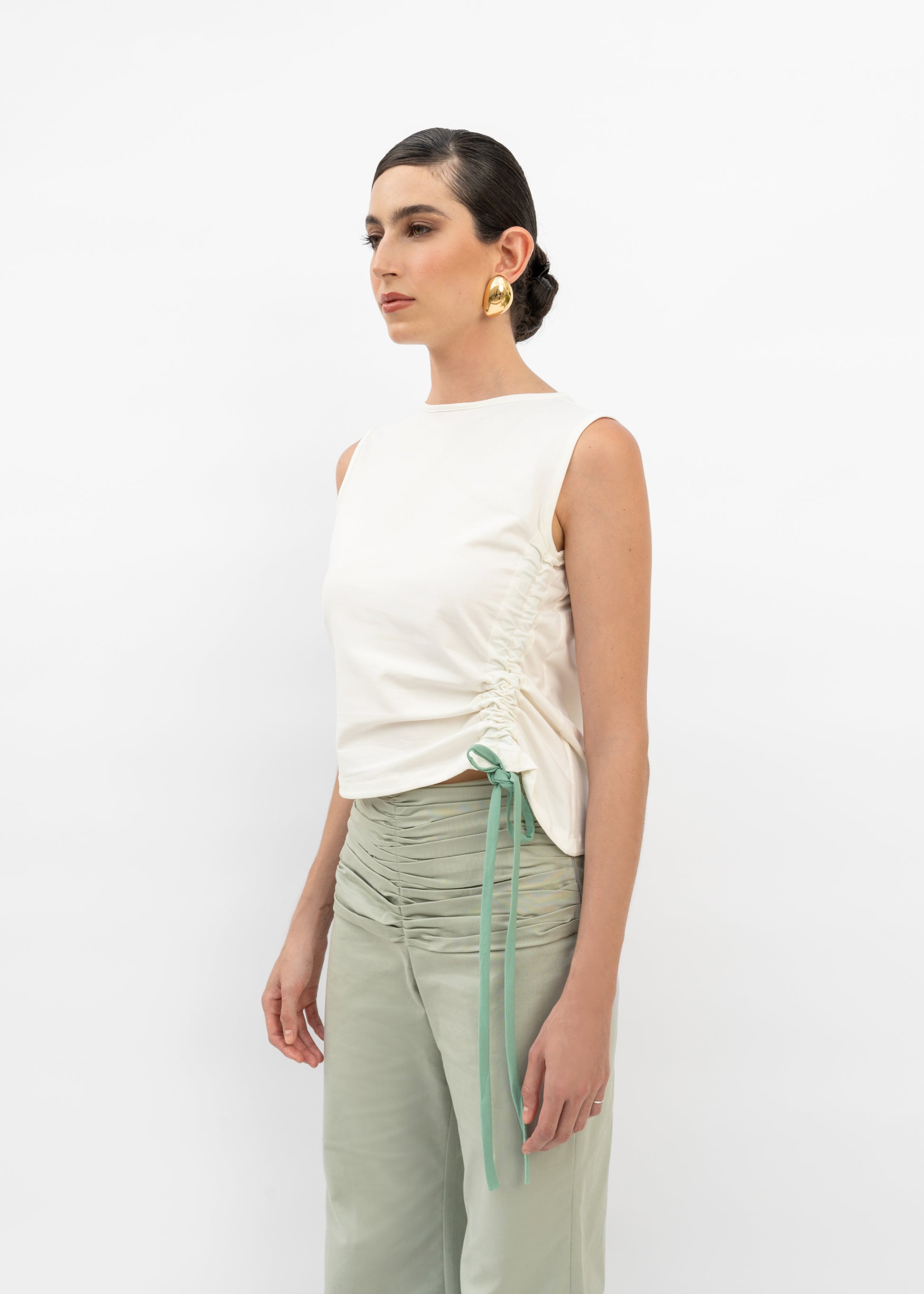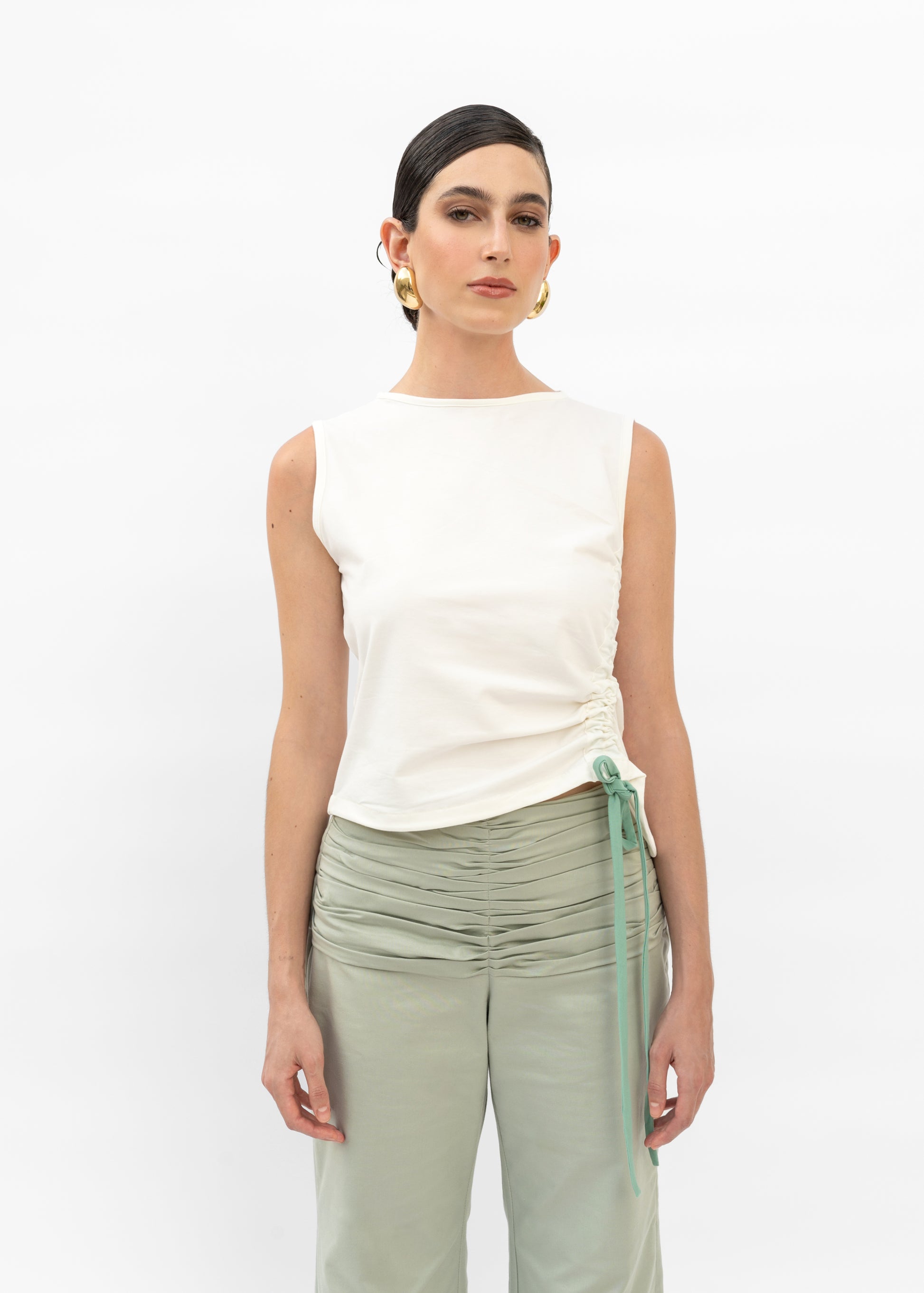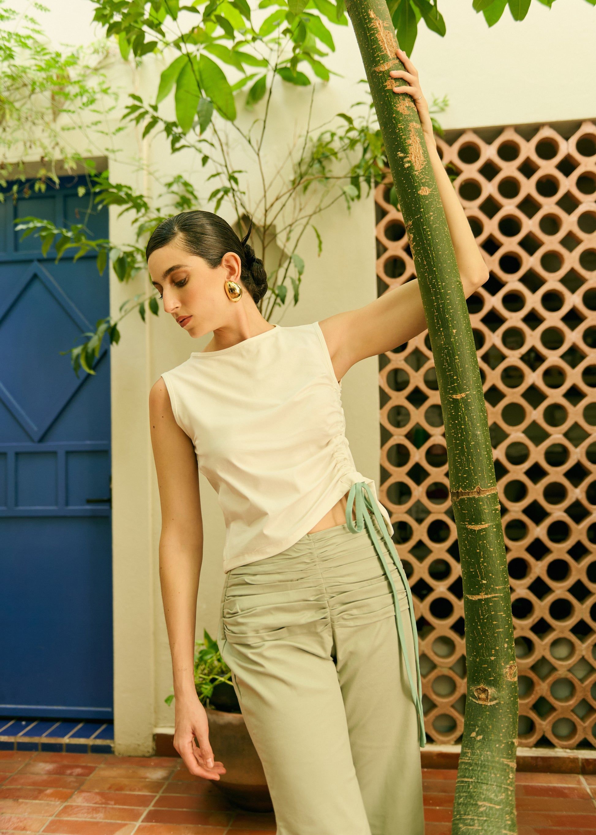 El Mojito top en color blanco tiene un diseño asimétrico y un strap verde ajustable con el cual puedes fruncir el lado más largo del top. Puedes llevarlo ajustado para un look más cropped o sin fruncir para uno más clásico. Su color y versatilidad lo convierten en un básico infaltable en tu closet.
