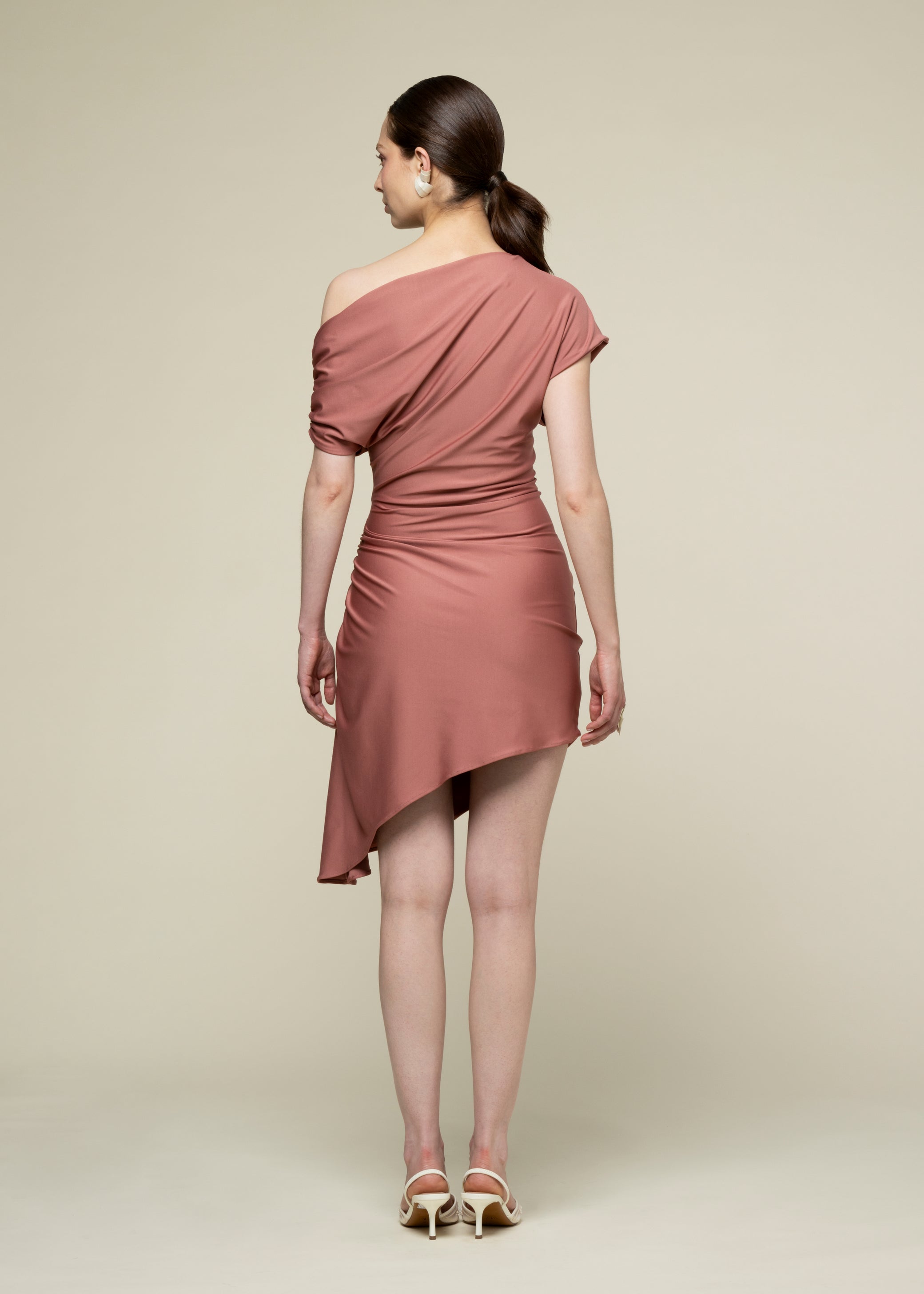 Corte asimétrico con un solo hombro y drapeado lateral que recoge la tela para favorecer tu silueta. El largo arriba de la rodilla